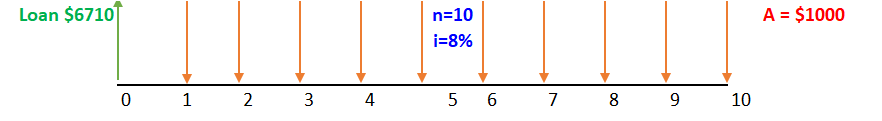 • Below chart mentioned when getting a loan of $6,710 (P) at 8% interest (i) and asking for repayment over 10 years (n), it will require a repayment of $1,000 (A) for 10 years